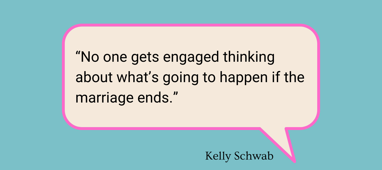 Full disclosure: I don’t have a prenup. I was 21 when I met Ken. We got engaged at 27 and married at 28, and even though I was sure I was a grownup, looking back, we were just a couple of babies who didn’t know anything about anything. At the time, I also didn’t know anyone who had a prenup—or if they did, it wasn’t something that they discussed with me.