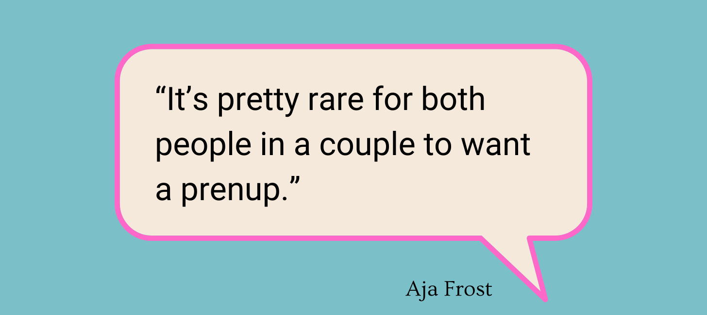 It turns out that it’s pretty rare for both people in a couple to want a prenup. (Both of our lawyers asked multiple times “who was driving.”) Usually, one person has more money and initiates.