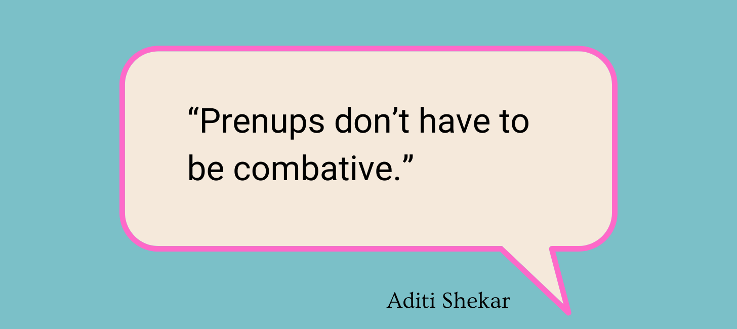 I’m really so excited about the women featured here today. Along with Aja, we have four smart women sharing why they think it’s important to get a prenup (and if you’re married, why you might want to consider a postnup). Cindy DiTiberio is the founder of the fantastic newsletter The Motherlode, where she writes about her own experience with divorce, as well as other women’s, in her series The Divorce Diaries. I’ve been lucky enough to know Aditi Shekar for nearly a decade, and she’s one of the smartest people around. She’s the founder and CEO of Zeta, a financial institution focused on helping couples and families thrive. Sol Lee is the founder and CEO of Neptune, a platform for couples navigating the prenup process. And Kelly Schwab is a partner at Chemtob, Moss, Forman and Beyda, LLP (and friend of my friend Heather). It’s a powerhouse lineup, if I do say so myself.