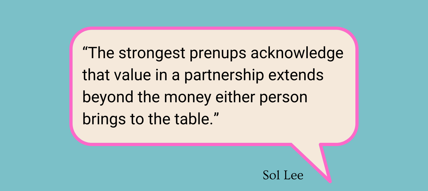 The best way to approach the prenup discussion is to focus on your shared vision of your life together, not the “in case of divorce” perspective. Imagine the life you want to build together. Do you want to buy a home? Do you want to have children? Will one of you take time off from work, and if yes, how can you protect each other’s contributions—both financial and non-financial? The strongest prenups acknowledge that value in a partnership extends beyond the money either person brings to the table. These decisions deserve thoughtful consideration before you’re in the midst of navigating them.