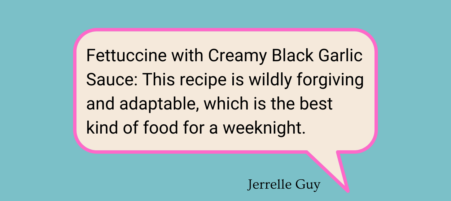 Just smash the black garlic cloves (they’re so soft, you can do this with a fork) in a large serving bowl with the cream cheese and Parmesan, then add in starchy pasta water until it all melds together into a silky, luxurious sauce. Toss in your cooked fettuccine, letting every ribbon soak up the sauce, and finish with herbs. It’s a no-fuss situation, with zero complicated techniques.
