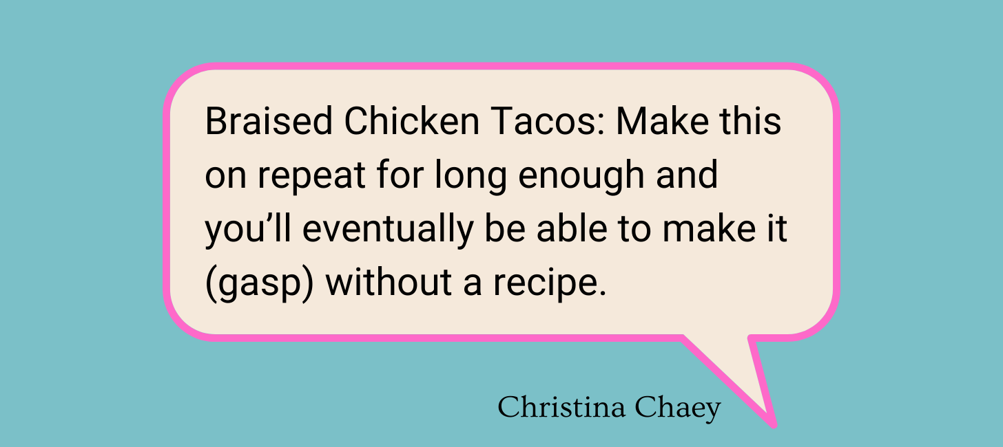 The thing I love most about this recipe is that once you know how to make chipotle-braised chicken, you’ll also sneakily know how to make just about any other braised meat, as they all pretty much follow the same method. Make this on repeat for long enough and you’ll eventually be able to make it (gasp) without a recipe—the ultimate weeknight dinner flex. (Truthfully, I never use a recipe when I make this dish—but if you like to follow a formal recipe, these chicken tinga tostadas with bacony black beans also hit the spot.)