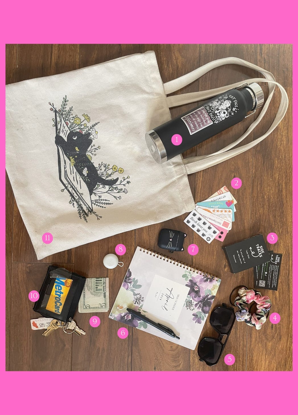- Tote bag. I prefer a tote over a traditional purse since I can fit more in it—including my groceries when I stop on the way home! This tote bag was a gift from my sister.
