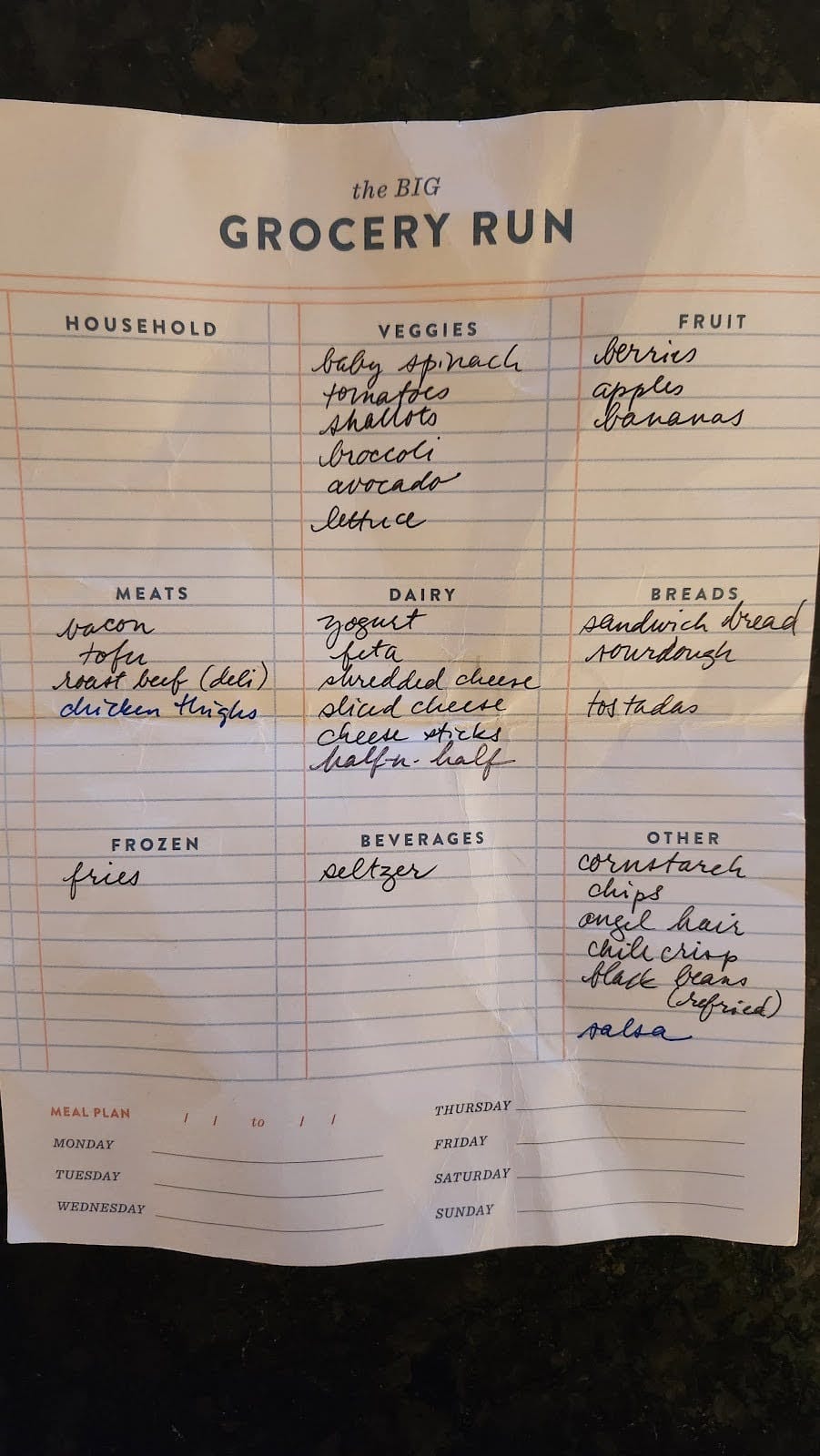 This included more than was on my written list (mostly items that my son packs in his lunch: meat sticks, Cheez-Its, rice pudding cups, chips) and a few pantry items that we were running low on (rice, chia seeds, bagels, protein pasta) and treats (smoked salmon).