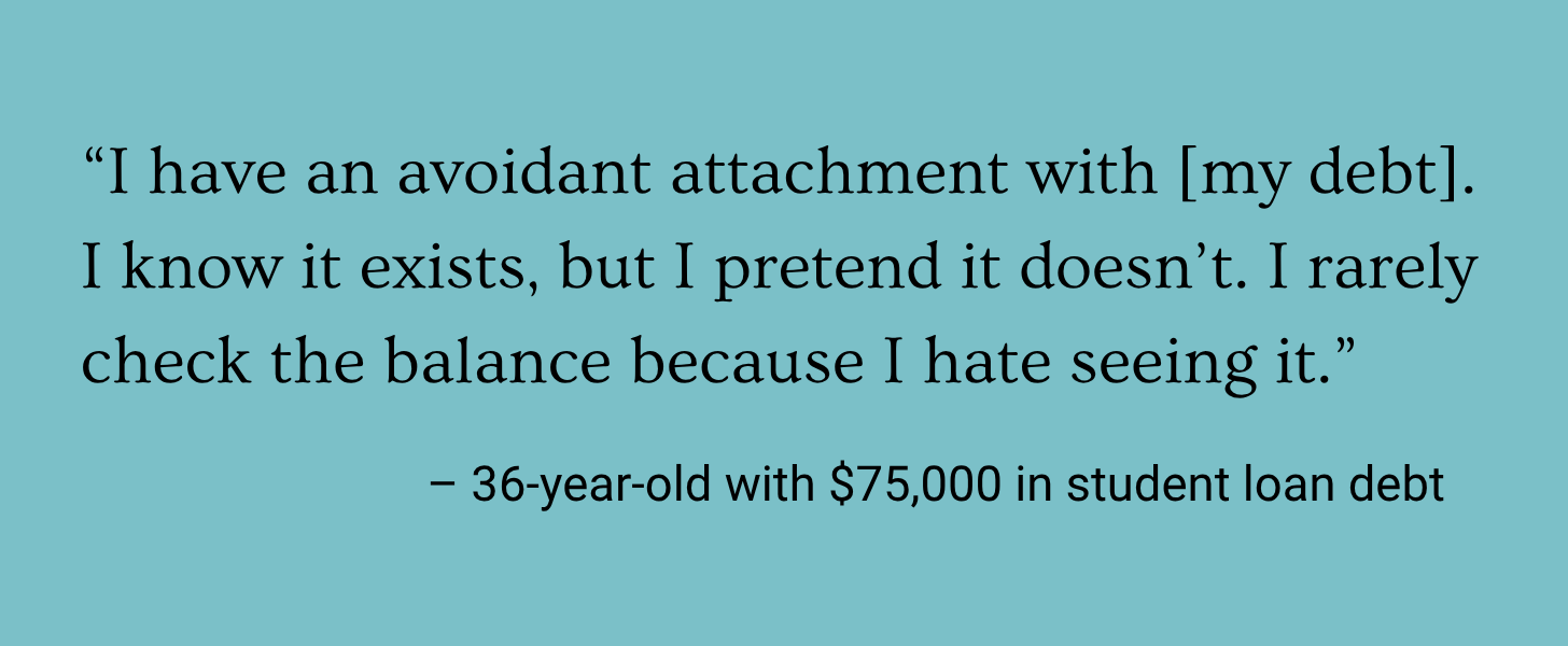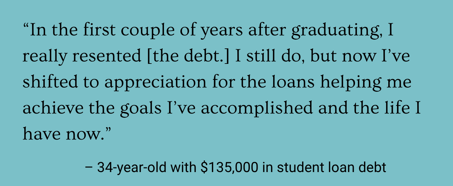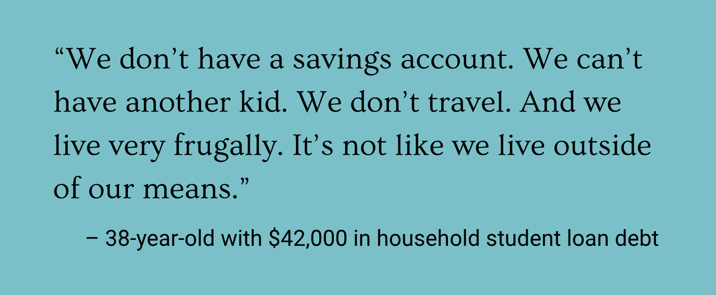 “I waiver from being extremely stressed to ignoring it and being in denial,” said a 38-year-old who attended medical school and pays over $2,000 a month in student loan debt. “There is a ton of guilt surrounding it for me, especially now that I have a family and child to provide for.”