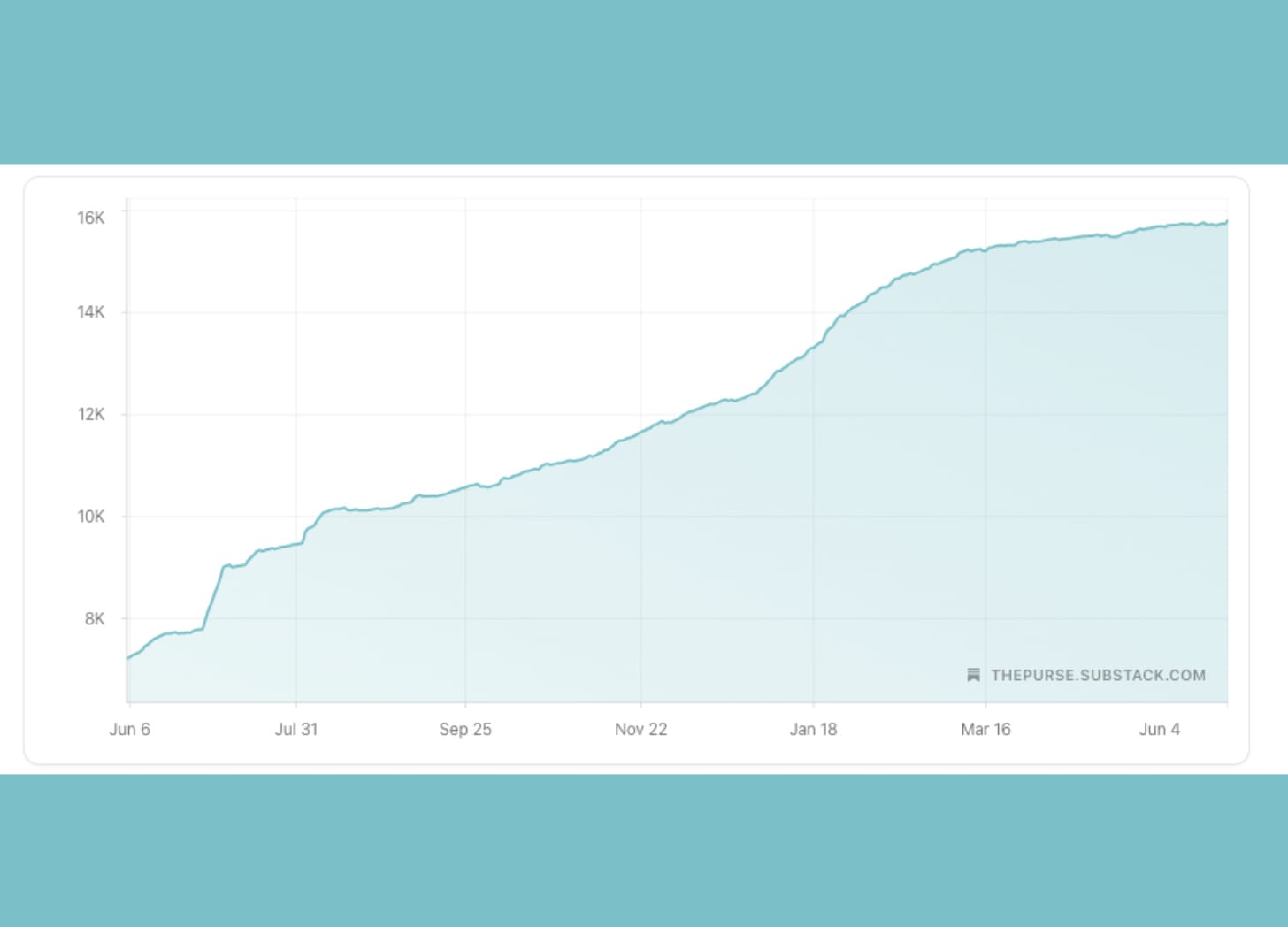 Twelve months later, The Purse has changed a lot. And also, it’s essentially the same. It’s just me, Lindsey, writing this newsletter every week. But there are a lot more readers! In June 2023, I sent the first newsletter to 200 people. In June 2024, my first anniversary newsletter went out to 7,000. This year, the subscriber base has grown to more than 15,000, and I have just shy of 600 paid subscribers.
