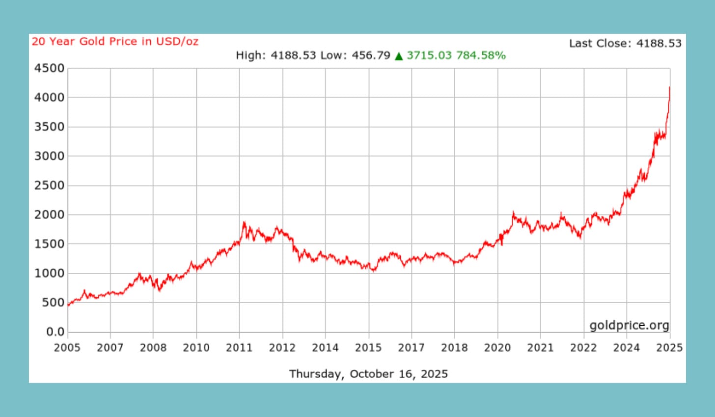 It’s worth it to take a step back to put into context how crazy gold’s price run has been. It first crossed $1,000 back in 2008 (when the timing aligns with another financial crisis). It didn’t hit $2,000 until the Covid pandemic, some 12 years later. It hit $3,000 earlier this year, due to President Donald Trump’s tariff mayhem. And now, just a few months later, it’s over $4,000, with some analysts claiming $5,000 per ounce by year end, if not next, is possible. That’s a 33% increase this year alone.